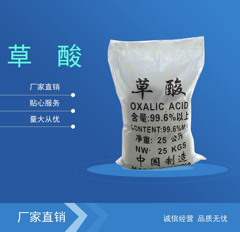 无色单斜片状或棱柱体结晶或白色粉末、氧化法草酸无气味、合成法草酸有味。150~160℃升华。在高热干燥空气中能风化。1g溶于7ml水、2ml沸水、2.5ml乙醇、1.8ml沸乙醇、100ml乙醚、5.5ml甘油,不溶于苯、氯仿和石油醚。0.1mol/L溶液的pH值为1.3。相对密度(d18.54)1.653。熔点101~102℃(187℃,无水)。低毒,半数致死量(兔,经皮)2000mg/kg。